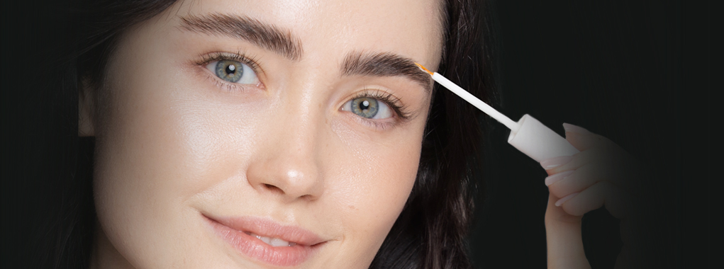 2. Take the bottle labeled Glue. Apply a small amount of the product on the brows and brush them into the desired position. Wait for a moment.